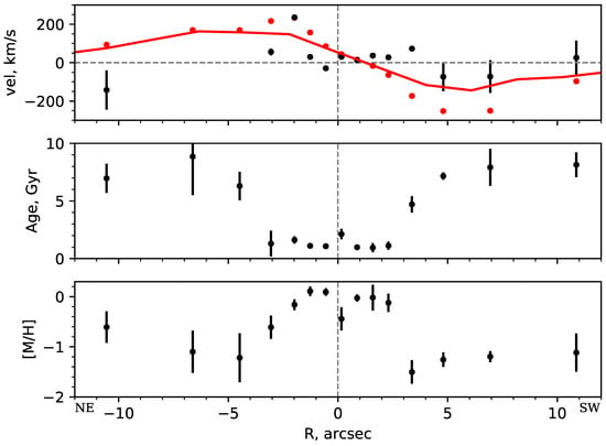 Gas/stars kinematics and stellar population properties derived from SCORPIO-2 observations at PA = . From top to bottom: line-of-sight velocity distribution for stars (black dots) and ionized gas (red), the red line shows the velocities in this direction according to FPI data, the systemic velocity 25,482 was subtracted; radial distribution of the SSP age; the same for the stellar metallicity.
