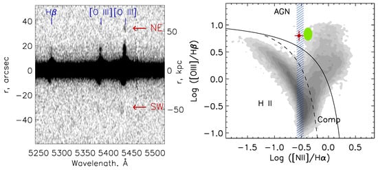 Ionized gas in the Teacup giant EELR. Left: a fragment of the 2D SCORPIO-2 spectrum along around the H + [O iii] region. The red arrows mark the NE and WS Arcs. Right: a BPT diagram similar to one the presented in Figure 3 []. The gray contours represent the density distribution of the SDSS galaxies line ratios based on the data from Kewley et al. []. The division lines between the star-forming galaxies, AGN, and composite nucleus are taken from Kewley et al. [], Kauffmann et al. []. The vertical blue shadowed area represents the range of values measured for the giant nebula at GTC []. The green filled ellipse shows the line ratios measured by Gagne et al. [] for the areanearest the AGN regions ( kpc). The red point corresponds to both our SCOPRIO-2 (I([O III] 5007)/I(H)) and GTC (I([N II])/I(H)) measurements for the distances r = 19–41 kpc.