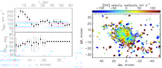 It is possible that the rotation curve presented in Figure 5 is affected by non-circular motions, first of all in the central kpc (location of the giant bubble—‘teacup handle’). This fact is indicated by both the radial changes and maps of the residual velocities (Figure 5, right) with well-ordered patches of negative and positive values. The maximal value of the deviations from the mean rotation () could be considered as the lower limit on the speed of a large-scale outflow; the projection effect can increase this value. Note that the amplitude of these non-circular motions along line-of-sight is significantly smaller than at the corresponding distances.