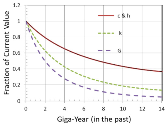 However, in the CCC theory, the constants do not evolve linearly with time. Their evolution is typically expressed in terms of the scale factor or redshift . For the speed of light, . Following our earlier work e.g., [61,64], when translated into time variation with the time unit of Gyr, it can be graphically depicted as in Figure 1. We could then write