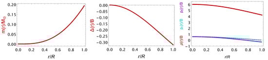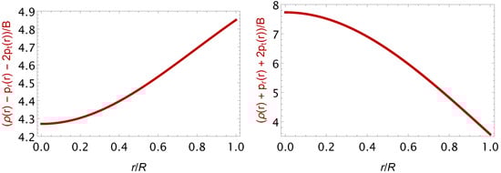 To clarify the situation, the last equation implies that this compact star results from the equilibrium between these three different forces, as is mentioned in Ref. []. In particular, if , we obtain the standard TOV equation. Moreover, in cases where (or equivalently ), causes a repulsive force in Equation (8) that counteracts the attractive force given by the combination . On the contrary, if we consider the case of (or ), is also an attractive force that adds to the other ones.