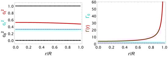 After the numerical computations, we display in a number of figures, several quantities of interest. In Figure 1, Figure 2, Figure 3 and Figure 4, on the x-axis we put the normalized radial coordinate , while on the y-axis we put the quantities of interest, such as the mass of the star in solar masses, dimensionless quantities (for instance, the relativistic adiabatic index), and normalized quantities (e.g., the pressures and the energy density as well as the anisotropic factor in units of the bag constant, B). The curves exhibit the usual behaviour observed in interior solutions describing hydrostatic equilibrium. In particular, the mass function increases starting from 0 at the centre, while its mass at corresponds to the star’s mass. The energy density and the pressures start from their central value and monotonically decrease until the radial pressure vanishes at the star’s surface. In contrast, the energy density acquires a surface value. The energy density and the pressures remain positive throughout the star, while the energy density always remains larger than the pressures, such that the energy conditions are fulfilled. Moreover, both sound speeds vary slowly with the radial coordinate, taking values within the range 0–1 throughout the star, so causality is not violated. The anisotropic factor turns out to be negative, which is always the case within the vanishing complexity formalism. Finally, the relativistic adiabatic index increases monotonically and rapidly acquires large values as we approach the surface of the star. At the same time, it always remains larger than the Newtonian value . In particular, we notice that: (i) the mass function increase, the anisotropic factor decrease and the energy density and pressures decrease throughout the star, (ii) the speed of sound, radial and tangential, increase and decrease, respectively, and both are lower than , the relativistic adiabatic index, , increase and it is always higher than , (iii) the corresponding energy conditions are also satisfied. Thus, in light of the these numerical results, we can confirm that the complexity factor formalism is a solid approach to obtain well-defined solutions in the context of compact stars.