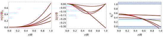 where is the radial pressure, and is the energy density of homogeneously distributed quark matter (also to in the Bag model). For the purpose of the present analysis, following Beringer et al. [], we take the strange quark mass () to be , while the accepted values of the bag constant, B, lie within the range MeV/fm [,]. Also, the parameter comes from QCD corrections on the pressure of the quark-free Fermi sea, and it is directly related with the mass-radius relations of quark stars. Note that as far as the EoS is concerned, only the radial pressure is relevant. The tangential pressure has already been defined in the Introduction as well as after Equation (2).