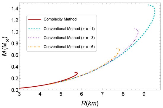Finally, in Figure 5, we show the mass-to-radius relationship for anisotropic stars for both approaches. First we study anisotropies within the vanishing complexity formalism, and we obtain the curve in red. Next, when we consider the conventional method, since now the ansatz for the anisotropic factor is characterized by a continuous parameter, we can observe the impact of that parameter on the profiles, corresponding to the other 3 curves in the figure. Increasing the anisotropy, the profile is gradually shifted towards the one corresponding to complexity. But at some point causality is violated, and therefore the solution is not realistic/viable any more. That is precisely the point where we must stop. The last allowed profile remains quite far away from the one obtained within complexity.