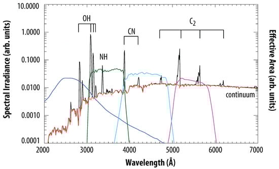 The coverage of the OH (A–X) band with the UVW1 filter was first discussed in the interpretation of the UVOT observations of the Deep Impact encounter with 9P/Tempel 1 [12]. To assess the continuum contribution to the UVW1 filter, an archival grism spectrum of 73P/Schwassmann–Wachmann 3C was used along with the assumption that comets 9P and 73P had the same OH and dust contributions within the bandpass of UVW1. Later studies used contemporaneous V-band observations to remove the continuum contribution from UVW1 images to create OH maps [16,37], analog to the image processing of narrowband filters [38], with the caveat that the V-band contains emission of the C radical (Figure 1) and that the exact continuum removal factor depends on the color of the dust, which must be either assumed or provided by other observations. Most recently, Xing et al. [17] developed a more sophisticated procedure to remove the continuum contribution from the UVW1 passband by combining theoretical OH column density distributions with observed V-band surface brightness profiles, and by using the color of the dust as a free parameter to identify the best fit.