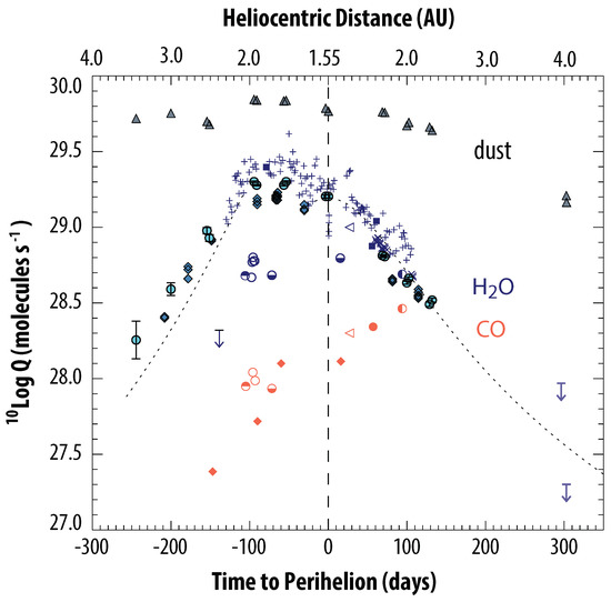Activity evolution of comet C/2009 P1 (Garadd), taken from [16]. HO production rates (blue symbols) peak ∼100 days pre-perihelion, while CO (red symbols) continues to increase even after perihelion. Perihelion is indicated by a vertical dashed line. Water production rates derived using imaging with large apertures (Swift/UVOT—cyan circles [16]; SOHO/SWAN—blue pluses [42] are much larger than those derived from observations with slit-based instruments (VLT/CRIRES—blue open circles and downward arrow pre-perihelion—[39]); Keck/NIRSPEC—blue lower half filled circle [40]; Keck/NIRSPEC and IRTF/CSHELL—blue upper half circle [41]. For a complete attribution of all measured production rates, see [16].