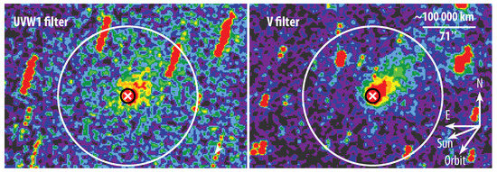 On 11 December 2010, the large, primitive asteroid 596 (Scheila) was discovered to have an unexpected increase in brightness of 1 mag and started developing what appeared to be a coma and tail [51]. This was a very exciting observation, as with the exception of 1 (Ceres), the most known active asteroids were relatively small objects with diameters of up to 5 km, whereas Scheila has a diameter of 160 km [4]. Swift observed the asteroid within days of the first announcement of the activity and acquired imaging and grism spectroscopy to investigate what caused this activity [6]. The UVOT images revealed two large ejecta clouds (Figure 6). Both the UVW1-V photometric colors of the dust and grism spectra ruled out the presence of significant amounts of OH, and thus HO. In addition, the plumes faded rapidly [52]. These observations ruled out the sublimation of water ice as the driver of activity. Instead, the plumes were caused by the impact of a much smaller asteroid (30–80 m in diameter, [6,52,53,54]). As such, Scheila was the first time the immediate aftermath of the collision between two asteroids was observed, allowing us to study a sub-critical impact on a primitive asteroid. Such an impact will have created a crater of about a kilometer in diameter, but subsequent observations of Scheila’s lightcurve imply that a much larger area on its surface was altered by the impact [55].