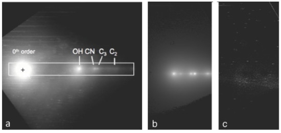 - Feldman, P.D.; Cochran, A.L.; Combi, M.R. Spectroscopic Investigations of Fragment Species in the Coma; Comets II; University of Arizona Press: Tucson, AZ, USA, 2004; p. 425. [Google Scholar]