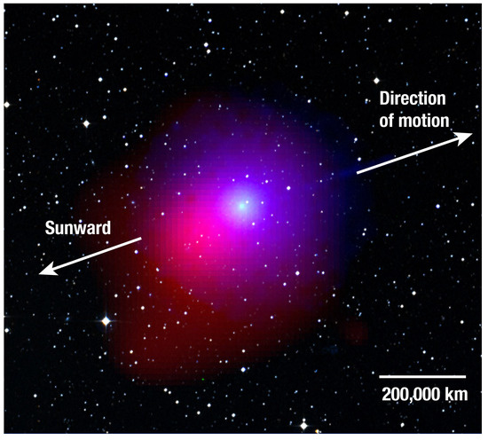 Combined Swift-UVOT and X-ray Telescope observations of comet C/2007 N3 (Lulin). This bright comet allowed UVOT to image the cloud of OH radicals in its coma (blue) and XRT to detect X-rays produced by solar wind charge exchange (red). Because of the comet’s large gas production rates, the coma is collisionally thick to charge exchange and is thus offset towards the direction of the Sun (after [37,74]).