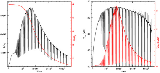 The variation with time (counted since the beginning of the AGB phase) of luminosity and current mass of the star (left panel, black and red tracks, respectively), and of the temperature at the bottom of the envelope and the mass-loss rate (right panel, black and red lines, respectively.)