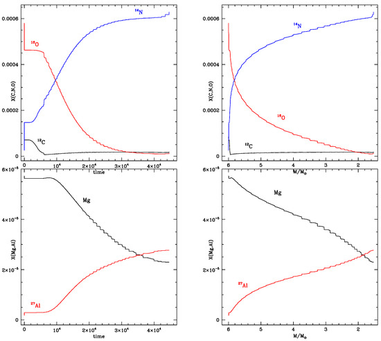 The variation of the surface chemical composition of a model star of metallicity in terms of the abundances of the most stable isotopes taking part to the CNO nucleosynthesis (upper panels) and of magnesium and aluminium (bottom panels). The various quantities are shown in terms of the AGB lifetime (left panels) and of the current mass of the star (right panels).