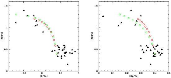 We start by following the same approach as in [34], and compare in Figure 5 the yields from the model stars obtained with the standard input described in Section 2 with the results from the observations, taken from [47]. We note that the evolutionary sequences for this analysis have been calculated on purpose, by assuming the same chemical composition (we refer in particular to the metallicity and the enhancement) of the 1G of the cluster, as given in [47].