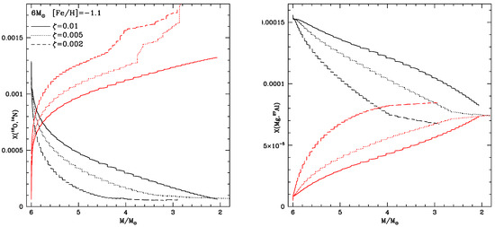 The variation of the surface chemical composition of the stars is shown in the right panel of Figure 3, in terms of the variation of N and O. The surface O decreases during the AGB phase, owing to the action of proton-capture reactions at the base of the envelope. This general trend is partly reversed during the final AGB phases, after HBB is practically turned off, and the surface oxygen increases under the effects of the third dredge-up (TDU) mechanism [41], which brings to the surface regions of the stars with the products of the helium-burning nucleosynthesis, primarily carbon and oxygen, which is activated in the convective shell which forms at each TP [32].