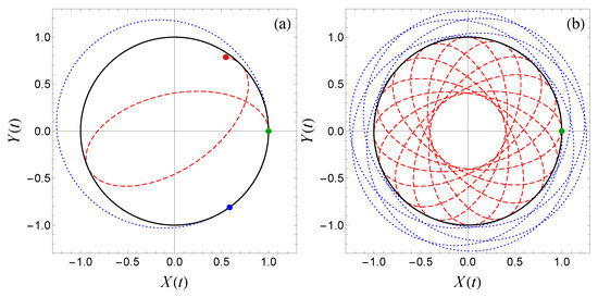 Plot of an embedded particle trajectory in a plane for a static BEC. Initial parameters given by . The lines correspond to different initial velocities given as —red dashed, —black solid and -blue dotted. Here, is a circular orbit velocity, and a rotation period of a particle with a circular orbit is . In plot (a) the trajectories correspond to the time and in plot (b) the trajectories correspond to the time when the particle return to the initial position (blue point) .