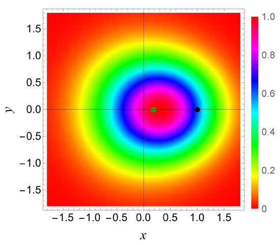 We assume that initially an embedded particle in some coordinate leads to the deformation of density and displacement of the center of mass of the condensate. This static state of condensate can be obtained by increasing the interaction parameter between the particle and condensate. In a Figure 3 presented a ground state of quasi-two-dimensional condensate numerically obtained by minimization of the energy (A5) [39]. In the figure, black and grey points are the initial position of the embedded particle and condensate center of mass, correspondingly. From the figure, one can see that, the value of interaction parameter is already enough to provide deformed nonuniform condensate density with a considerable displacement of the center of mass.