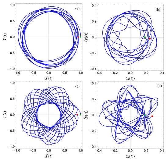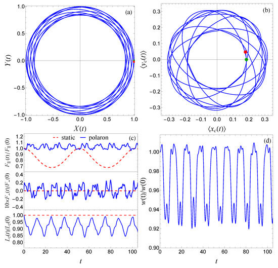 Figure 4 demonstrates the trajectory of the polaron, center of mass of the condensate Initial velocities of polaron defined by Equation (10) for corresponding interaction parameter that has to provide circular trajectory without polaron effect. Comparing the Figure 4a,c with black solid and red dashed lines of Figure 2b correspondingly, we see the polaronic effect on the trajectories. In fact, these perturbations of polaron trajectories strongly being interconnected with the irregular dynamics of the center of mass of the condensate in Figure 4b,d. These interconnected nonuniform dynamics between the center of mass of condensate and polaron arise from the following causes: