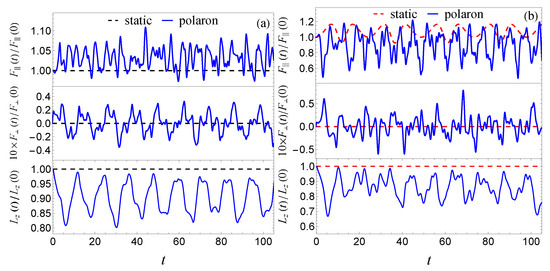 where it is assumed that is approximate ground state for polaron position . As a result, the polaron velocity cannot resist the non-linearity between the centripetal forces (14) attracting the condensate to the origin of the coordinate and (3) attracting the polaron to the center of mass of the condensate. Eventually there arise strong irregularities to the trajectories, presented in Figure 4a,b. Moreover, decreasing initial velocity by factor 0.5 increases these irregular dynamics that correspond to Figure 4c,d. In Figure 4 red points present the final position of the particle and center of mass of the condensate. Figure 5a,b is a plot of parameters (11) and (12) that compare the cases of the static BEC with particle and displaced condensate with polaron. From the plots, it follows that polaron formation leads to strongly nonlinear oscillation of forces (11) and angular momentum (12). Furthermore, comparing to Figure 5a,b, one can see that decreasing of initial velocity increases the intensity of nonlinearity. Furthermore, Figure 5 completely proves the conditions (13).