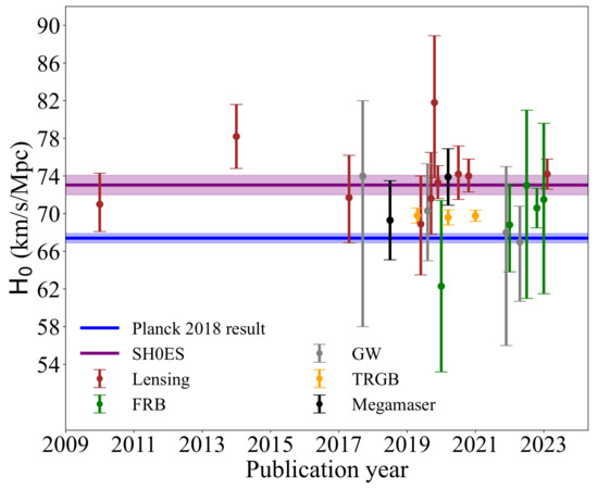 The local expansion rate of the universe is a fundamental value. It also determines the age of the universe; thus, it is important to determine it accurately. The accuracy of measurements has been improved as the number of probes has increased. A review of most well-established probes can be found in literature [99]. In general, the measurements can be estimated from the cosmological model utilizing the early universe measurements, or more directly measured from the local universe. Interestingly, the values measured by these two approaches are inconsistent. The discrepancy between the values measured from the local distance ladder and from the CMB is the most serious challenge to the standard CDM model. This discrepancy is also known as “Hubble Tension” [87].
