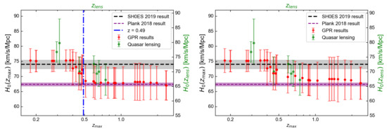 A similar descending trend obtained from the combined sample (including megamasers, CCs, SNe Ia and BAOs) and Pantheon sample. Left panel shows the result obtained from the combined sample. The statistical significance of descending trend is 2.1. Right panel shows the result of Pantheon sample which can reduce the tension by 66%. (Source: left panel, Figure 2 in Krishnan et al. [487]; right panel, Figure 5 in Dainotti et al. [417]).