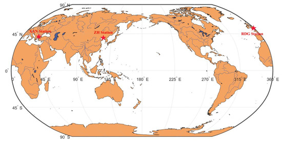 Map of the global locations of the RDG station, the XAN station, and the ZH station (the three red stars indicate the stations.).