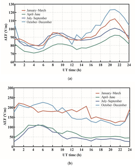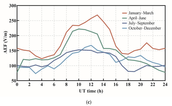 In Figure 2a, signifying strong convection at 8 UT to 20 UT, and the four different colored curves are all characterized by “double peaks, double valleys”, with the January–March, October–December, and July–September curves being nearly identical, and they are higher than the April–June curve before 12 UT. Between 12 UT and 24 UT, the October–December curve is the highest, followed by the January–March curve, the July–September curve, and the April–June curve. In Figure 2b, the values in Jan.-Mar. and October–December are much higher than expected from the Carnegie curve, while the other two curves’ values are similar to the Carnegie curve, signifying strong convection at 5 UT, and the four different colored curves are all characterized by a “single peak, single valley”. At most moments, similar to those between 12 UT and 24 UT in Figure 2a, the January–March and October–December curves are the highest. A submaximal value appears at 15 UT of the January–March curve, which may be caused by artificial aerosols. While Figure 2c is quite different from Figure 2a,b, the four different colored curves are different: the January–March and July–September curves are “double peaks, double valleys”, while the April–June and October–December curves are a “single peak, single valley”. The January–March curve is the highest, followed by the April–June curve, and the July–September curve is nearly the same as the October–December curve. By comparing their curves with the meteorological conditions, for the RDG station, the results of the ranking of the percentage of fair days are April–June > July–September > January–March > October–December, which is the opposite trend from that shown in Figure 2a. For the ZH station, the ranking of the percentage of fair days is October–December > January–March > July–September > April–June, and this is the same as the results in Figure 2b. For the XAN station, there is signifying strong convection from 8 UT to 14 UT, again in the middle of the day local time. In addition, the ranking of the percentage of fair days is July–September > January–March > October–December > April–June, which is different from the results in Figure 2c. In Figure 2a, the January–March, April–June, July–September, and October–December peaks and valleys are consistent with each other. The same is true for Figure 2b,c except for some minor differences due to unavoidable systematic errors. The measurement data will be jittered with large values for a short time sometimes, caused by the measurement instrument; this can lead to minor errors in the results. Therefore, it can be concluded that the fair-weather average AEF variation curves for different regions on Earth vary, their annual variation characteristics vary, and the relationship between annual variation and meteorological conditions also varies. For a certain region, the AEF values vary for different seasons, but their curves are the same shape.