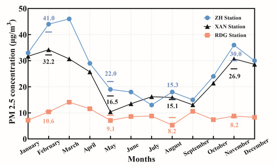 Mean monthly PM 2.5 concentrations at the ZH station, the XAN station, and the RDG station in 2021 (the short horizontal lines and digits beside them are the average concentrations corresponding to different seasons.).