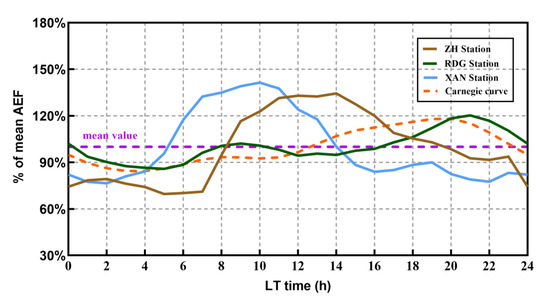 The daily variations at the RDG, ZH, and XAN stations were averaged to obtain the total fair-weather average AEF variation curve, which makes the mean value of the AEF 100% for the three stations, as shown in Figure 4. In Figure 4, the horizontal axis represents the LT time, and the vertical axis represents the percentage of atmospheric electric field/mean atmospheric electric field. The brown curve represents the percentage curve of average fair-weather AEF daily variation of the ZH station, the blue curve represents the curve of the XAN station, and the green curve represents the curve of RDG station, and the purple dashed line indicates the mean value (100%).