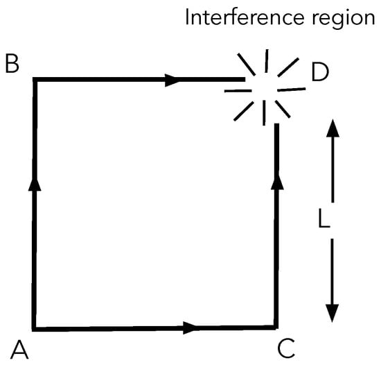 A nearly mono-energetic beam of particles with velocity v, that may be thermal neutrons or almost-spherical macromolecules, such as fullerene , is split into two parts at a point A. The resulting beams travel towards the mirrors B and C where they are reflected and then are brought together in D at time , as shown in Figure 1. Because the size of the wave packets can be assumed to be much smaller than the macroscopic dimension of the square loop (that in a neutron interferometer is of the order of 10 cm), it is possible to consider the trajectories as classic. Let us make the assumption that the two alternative paths ABD and ACD are subject to different external potentials (for example, the Earth’s gravitational potential, or an electric potential). Under these conditions, the term in (4), corresponding to ordinary QM amplitudes’ summation, is given by