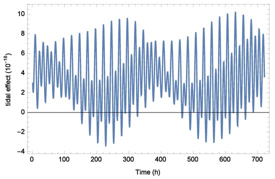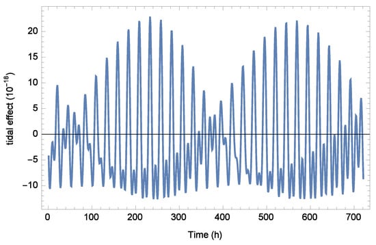 To demonstrate tidal effects on clock experiments, we simulate the clock comparison between two locations, and . The geographic location information is that the east longitude and north latitude of are E and N (Wuhan), and that of are E and N (Beijing), respectively. The distance between and is about 1100 km. We shall use nominal planetary ephemeris, astronomy parameters, gravitational constants of Earth, Sun and Moon, etc. Figure 1 shows the calculated fractional frequency shift due to the tidal potentials between and , and the date begins from 1 January 2024 with a total time of 720 h. From the figure, tidal effects on clock comparison present an obvious periodic signal with around peak to peak. The measurement of this effect is achievable for modern clock experiments. Considering a feasible experiment, the and perform clock comparisons with frequency instability of . After an observation time of 60 days, a test of tidal effects on clock comparison can reach the level of 1%. Considering the clock-comparison experiment in the Tokyo Tower [], the tidal effects lead to only a fractional frequency shift with an order of , which can be negligible for current clocks. From Equation (24), the tidal effects are more significant for clocks with greater distances or height differences. However, for the current clock comparison experiment with tower, measuring the tidal effects requires the accuracy and stability of the clocks to reach a level of or .