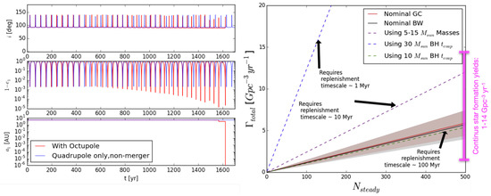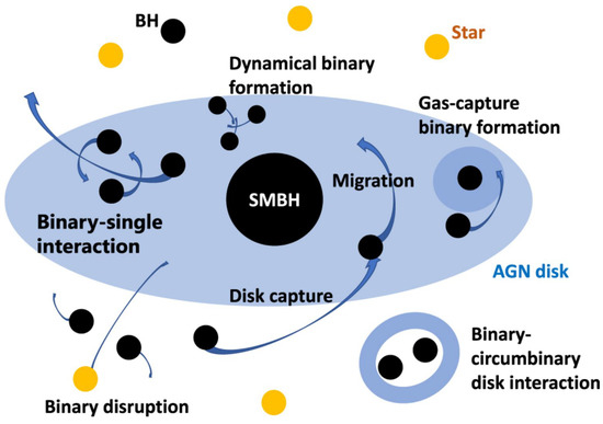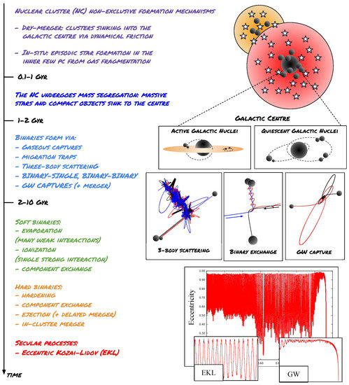 From the theoretical standpoint, the formation of COBs in galactic nuclei is rather uncertain, as it depends on many features, among which are the NC formation process, the SMBH influence, especially if it is in its active phase, the stellar evolution, and the secular dynamics. The high densities of galactic nuclei and NCs can favour stellar interactions, potentially boosting COB formation, but the large velocity dispersion associated with a central SMBH or a cuspy matter distribution hampers them, making it hard to assess the actual formation, and merger, rate of COBs in galactic nuclei. After formation, a COB can undergo further interactions with passing stars, which can lead to the binary shrinkage, to the replacement of one component, or to its disruption [11,12,13]. The SMBH gravitational field can alter the COB evolution, causing periodic oscillations of the binary eccentricity, the so-called eccentric Lidov–Kozai (EKL) mechanism [14,15,16,17,18,19,20,21], which can ultimately lead to its coalescence. The gaseous disc surrounding SMBHs in active galactic nucleus (AGN) can strongly affect compact object (CO) dynamics, damping their orbits and boosting binary–single and single–single scatterings, possibly favouring binary formation (e.g., [22,23,24,25,26,27,28,29,30,31,32,33,34,35]).