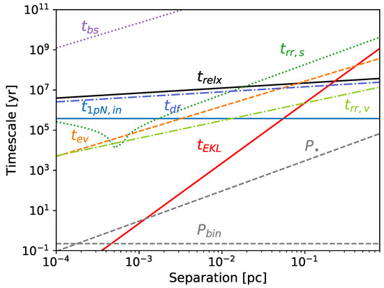 Timescales of several mechanisms affecting the formation of single and binary compact objects in a galactic nucleus similar to the Milky Way. Here, we assumed a binary mass and a supermassive black hole mass . Different lines identify different processes: 2-body relaxation (), scalar () and vector () resonant relaxation, evaporation (), dynamical friction (), binary–single scattering (), eccentric Kozai–Lidov (), general relativistic precession (), binary period (), orbital period of the binary about the supermassive black hole (). For the sake of visibility, the plot does not include the AGN lifetime (nearly constant line, 1–100 Myr) and the three-body and gravitational wave capture (single–single) scattering time, which are much larger than all other timescales for the adopted example.