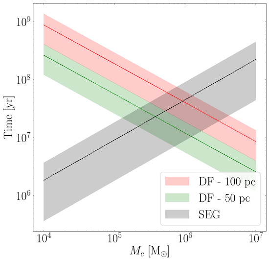Figure 3 compares the dynamical friction and mass segregation timescales for a population of COs with mass = 5–50 inhabiting star clusters with a mass in the range and half-mass radius [277], orbiting at a distance of pc in a galaxy with total mass , scale radius kpc, and the slope of the density profile .