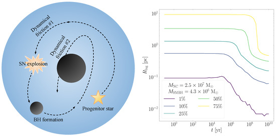 In order to provide the reader with a simple view of how the interplay of single-star stellar evolution and dynamics can shape the evolution of COs in galactic nuclei, we exploited the B-POP population synthesis code [99], which combines stellar evolution models for single and binary BHs obtained with the MOBSE tool [280] and semi-analytic recipes to describe the motion and pairing of BHs via dynamics. Using B-POP, we considered an NC with mass and assumed that a fraction ∼ of such mass consists of BH progenitors, assuming that the underlying mass distribution follows a standard initial mass function [255]. For each BH progenitor in the NC, we retrieved the final BH mass, the lifetime, and the SN kick. We divided the time into logarithmic bins and calculated the BH progenitor position via Equation (9). As soon as the time exceeds the i-th progenitor lifetime, we turned it into a BH (assuming a metallicity ) and assigned a natal kick amplitude , which was based on the stellar evolution recipes implemented in the MOBSE population synthesis tool. Given the kick, we assumed that the newborn BH will reach a maximum distance in a travel time , and then, it comes back over a dynamical friction time. In order to simplify the visualisation of such a complex system, we present in the sketch in the left panel of Figure 4a a cartoon showing the evolution of BH progenitor stars. More quantitatively, we show in the right panel of the same figure the time evolution of the radii containing the —referred to as Lagrangian radii—of BH mass in this simple toy model. The SN kick effect is rather small, owing to the relatively small kick amplitude compared to the NC velocity dispersion, suggesting that, in an MW-like nucleus, mass segregation is practically accomplished over a timespan of ∼ yr.