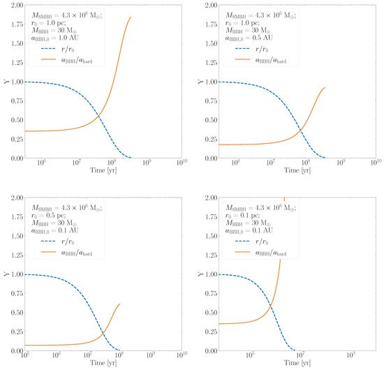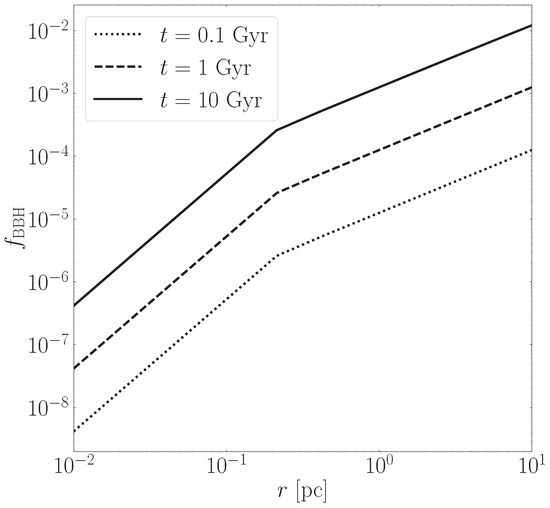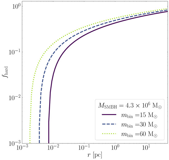Figure 5 shows how the hard binary fraction varies as a function of the distance to the SMBH for the Milky Way centre, highlighting how only a tiny fraction of the most-massive binaries can still be hard within 1–10 mpc from the SMBH. At those distances, though, the hard binary separation is ; thus, it is highly likely that a stellar binary would quickly merge.