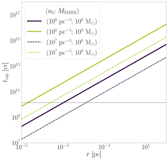 Do NCs form first and SMBHs grow later or vice versa? This basic “chicken or egg” question is still unanswered. From the observational point of view, while SMBH candidates have been observed up to redshift [250], it is practically impossible to distinguish an NC at those cosmological distances, thus making it impossible to date the oldest and farthest NCs. From the theoretical point of view, some works propose that primordial NCs in high-redshift galaxies can sustain the formation of SMBH seeds via BH merger and accretion events (e.g., [251,252,253,254]), whose subsequent growth could evaporate the NC. Whilst this possibility may explain the dearth of NCs in the most-massive galaxies, it is at odds with their observation in low-redshift () galaxies with masses , thus suggesting that there may be different NCs formation processes. Other theoretical works, instead, propose that the SMBH forms first and an NC forms later, either via the fragmentation of gaseous clouds [233] or star cluster infall [238]. For simplicity, in the following, we assumed that SMBHs are already fully grown at NC formation.