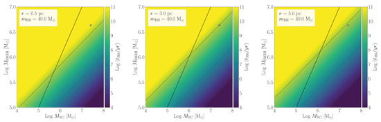 The plot suggests that the population of massive stellar objects has already been “dynamically processed” in clusters with a mass when they reach the galactic centre, whilst the population in the heavier cluster should be more representative of the cluster’s initial population. Let us consider a population of clusters each composed on average of members, a fraction of which are in COs and a fraction of their COs in binaries. If a fraction of all COBs survives the cluster infall, the total number of delivered COBs via the dry merger mechanism will be [48]
