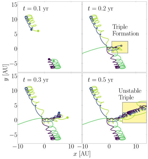 Regardless of the formation scenario, in a dense environment around an SMBH, a binary system frequently encounters other stars (e.g., [30,203,210,283,284,285,286,287,288,289]). This process results in a variation of the angular momentum and energy of interacting stars or COs with passing neighbours, displacing them from their position and forcing them to wander around the SMBH (e.g., [203]). When a passing star or a compact object approaches the binary with the impact parameter on the order of the binary’s separation, it interacts more strongly with the closer binary member. The outcome of this interaction depends on the ratio of the binary’s gravitational binding energy to the kinetic energy of the neighbouring stars. We will discuss in detail the possible outcomes of these “binary–single” interactions in Section 5.3.3.