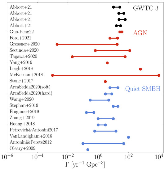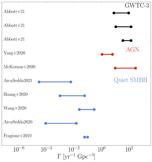 - Ford, K.E.S.; McKernan, B. Binary Black Hole Merger Rates in AGN Disks versus Nuclear Star Clusters: Loud beats Quiet. arXiv 2021, arXiv:2109.03212. [Google Scholar]
