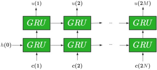 At first, the neural network is a two-layer recurrent neural network. It takes the far-field data as the input, the information parameter as the output, and the GRU gate control unit as the basic computing unit. The neural network is used for the reconstruction of the information parameter . Its structure is shown in Figure 2. The rectangle represents the GRU gate control unit, and its structure is shown in Figure 3.
