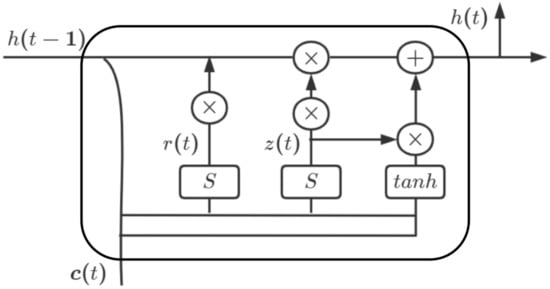 where is a sigmoid activation function, is the hyperbolic tangent activation function, can be any activation function, , , , are the weight of the reset gate, the intermediate state, the update gate, and the output layer, respectively, ⊗ denotes the matrix corresponding element multiplication, and ⊕ denotes the matrix splicing.