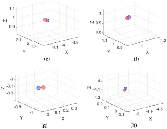 The reconstructed effect of the location and magnitude of a single source is plotted. The size of the points represents the module of the magnitude of the source, the blue points represent the real information of the source, and the red points represent the reconstructed information of the source. Each subplot represents the reconstruction result of different points. (a–d) are the reconstruction of the location and magnitude of the source in 2D, and (e–h) are the reconstruction of the location and magnitude of the source in 3D.