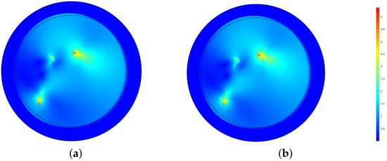 In Figure 6, the reconstructed red dot has a good coverage of the real blue dot, which means that the reconstruction results are good. In order to accurately see the results of the reconstruction, Table 6 and Table 7 give the number, location, and magnitude parameter information of real and reconstructed sources. Comparing the relative error range of Table 6 and Table 7, we can see that the increase in the number of point sources does not affect the accuracy of the results.