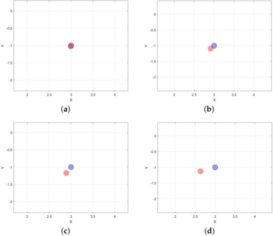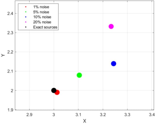 Table 8 shows the reconstruction results of one point source with location (3, 2) and magnitude (5, −7) at different noise levels. From it, we can plainly observe that the reconstruction results gradually deteriorate and the relative error increases as the noise level rises. This can also be verified in Figure 8. The distance between the reconstruction location and the exact location increases with the noise intensity. It has no discernible effect on the results when less than 5% noise is added. The location of the reconstruction significantly deviates from the genuine place as the noise level rises above 10%.