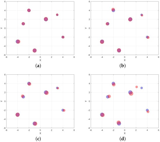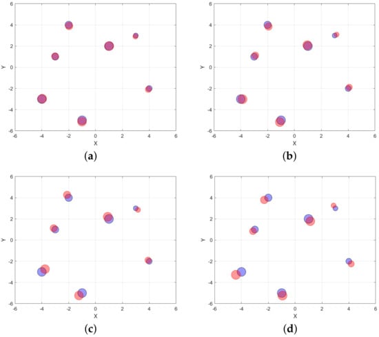 The reconstructions of the multi-sources with different noise levels. Here, (a–d) represent the , , and , respectively.
