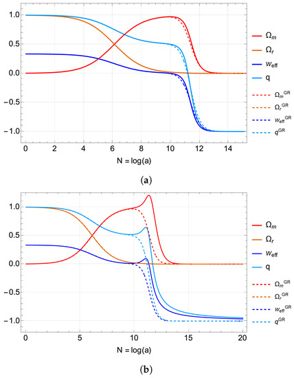 Evolution of density parameters , , effective equation of state , and deceleration parameter q for GR with a positive cosmological constant (dashed) and Anagnostopoulos et al. model (solid line). (a) Evolution for positive . (b) Evolution for negative .