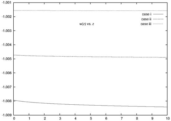 The Equation of state today, w(0) + 1, computed from Equation (80) in three relevant cases, which all describe the dark energy observed today (Equation (89)): (i) no neutrino contribution to the dark energy; (ii) a Majorana neutrino contribution with mass meV; (iii) a Dirac neutrino contribution with mass meV. See the discussion in Section 9.