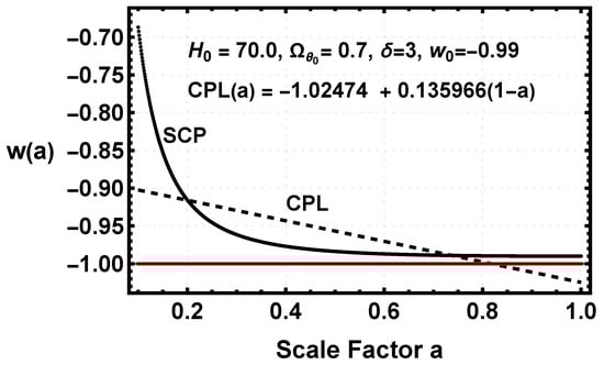 Given the many observational successes of the CDM static cosmology, boundary conditions close to CDM were chosen in the study. In particular, values close but not equal to −1 were adopted. This choice produced a simplification of the beta function formalism, where the beta function for quintessence is the negative of the logarithmic derivative of a slightly modified dark energy density. The beta function was then accurately approximated by the logarithmic derivative of the potential. Care should be taken in using the formalism for w values significantly different than −1. Equation (7) shows that the kinetic term X is directly proportional to . If becomes too large, the approximation can break down, and other means must be employed. The SCP templates are calculated by imposing the Friedmann constraints on the parameters. Since the studied epoch included only the matter-dominated and dark energy-dominated epochs, radiation is not included in the calculations. This precludes utilization of the templates for scale factors smaller than 0.016, such as the CMB-dominated epoch, that have significant radiation densities.