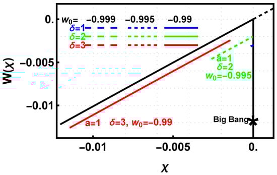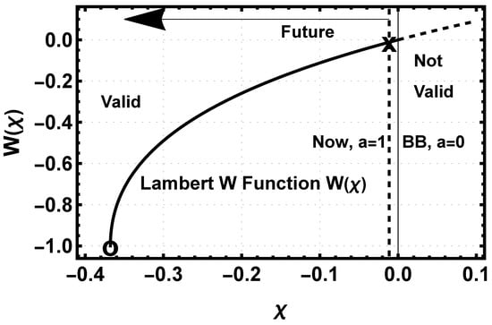Figure 2 shows the evolution of ) as a solid line for negative and a dashed line for positive . The negative portion of the Lambert W function terminates at , while the positive portion continues indefinitely. Only the negative portion has real solutions for the scalar. Equation (26) shows that is negative for all positive values of the scale factor a. Evolution in Figure 2 proceeds from right to left as the top arrow indicates. The variable is zero when ; therefore, the Big Bang is at as shown by the vertical thin line. The dashed vertical line just to the left of the Big Bang shows the maximum excursion of the greatest evolution case, and . All of the cases considered here have values much less than 1, which means that .