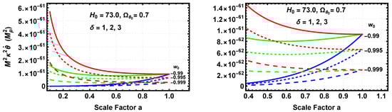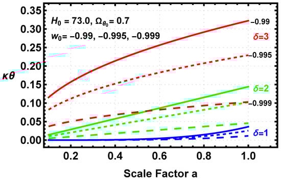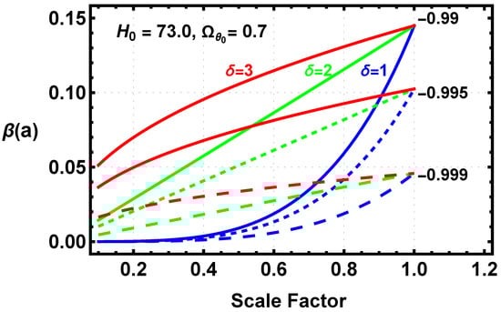 Although the general nature of the evolution of the beta function is different from the scalar, it shows the same change in the second derivative of the evolution, positive for , almost zero for , and negative for . The absolute value of is small and decreases as approaches −1. The current value of beta, , is identical for a given value of due to Equation (14), which sets at , where the subscript 0 indicates the current values. The beta function appears in many cosmological parameters due to Equation (13) that links and the Hubble parameter.