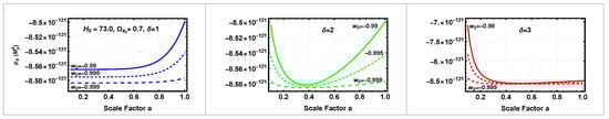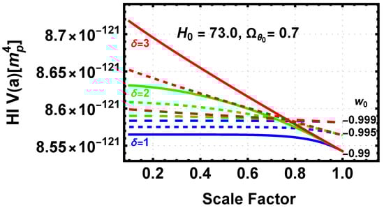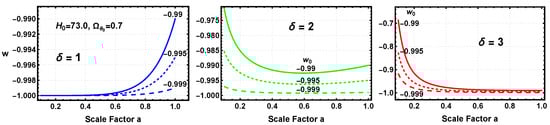 The values for the case are labeled on the plot. The order and line styles are the same for the other two values. The evolution is relatively small consistent with a slow roll. As expected the scalar values are monotonically increasing. The most striking feature is that the second derivative of the evolution changes from positive for to almost zero for to negative for . The three, seemingly arbitrary, delta values were chosen to illustrate this transition. The transition has a large effect on some parameters, such as the dark energy EoS, w, but relatively little effect on the Hubble parameter as is shown later in Figure 7.